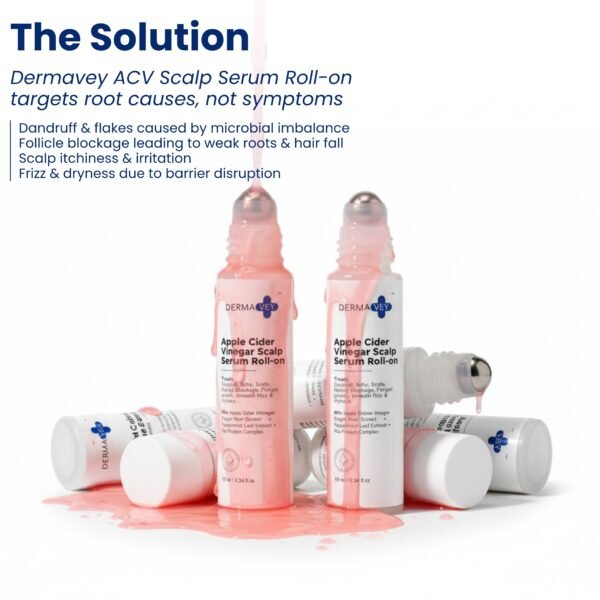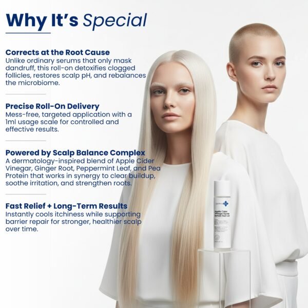 Targeted relief for a troubled scalp. This 10 ml roll-on serum treats Dandruff, Itchy Scalp, Follicle blockage, Fungal growth, Smooth frizz, & dryness. It is formulated with Apple Cider Vinegar, Ginger Root Extract %, Peppermint Leaf Extract, and Pea Protein Complex to deliver active ingredients directly where needed for scalp health and relief.