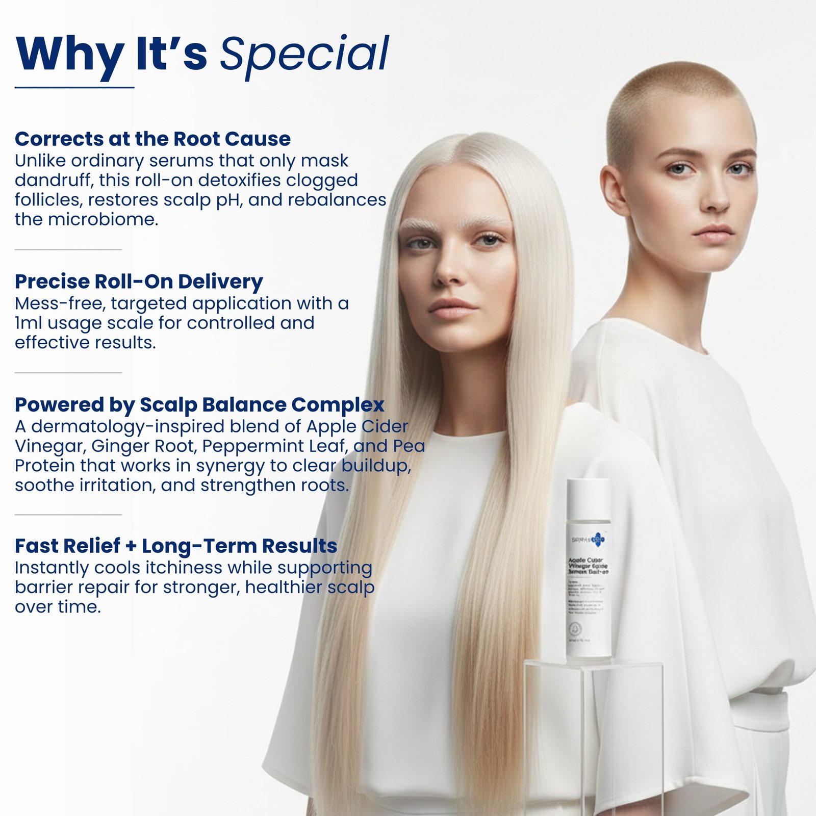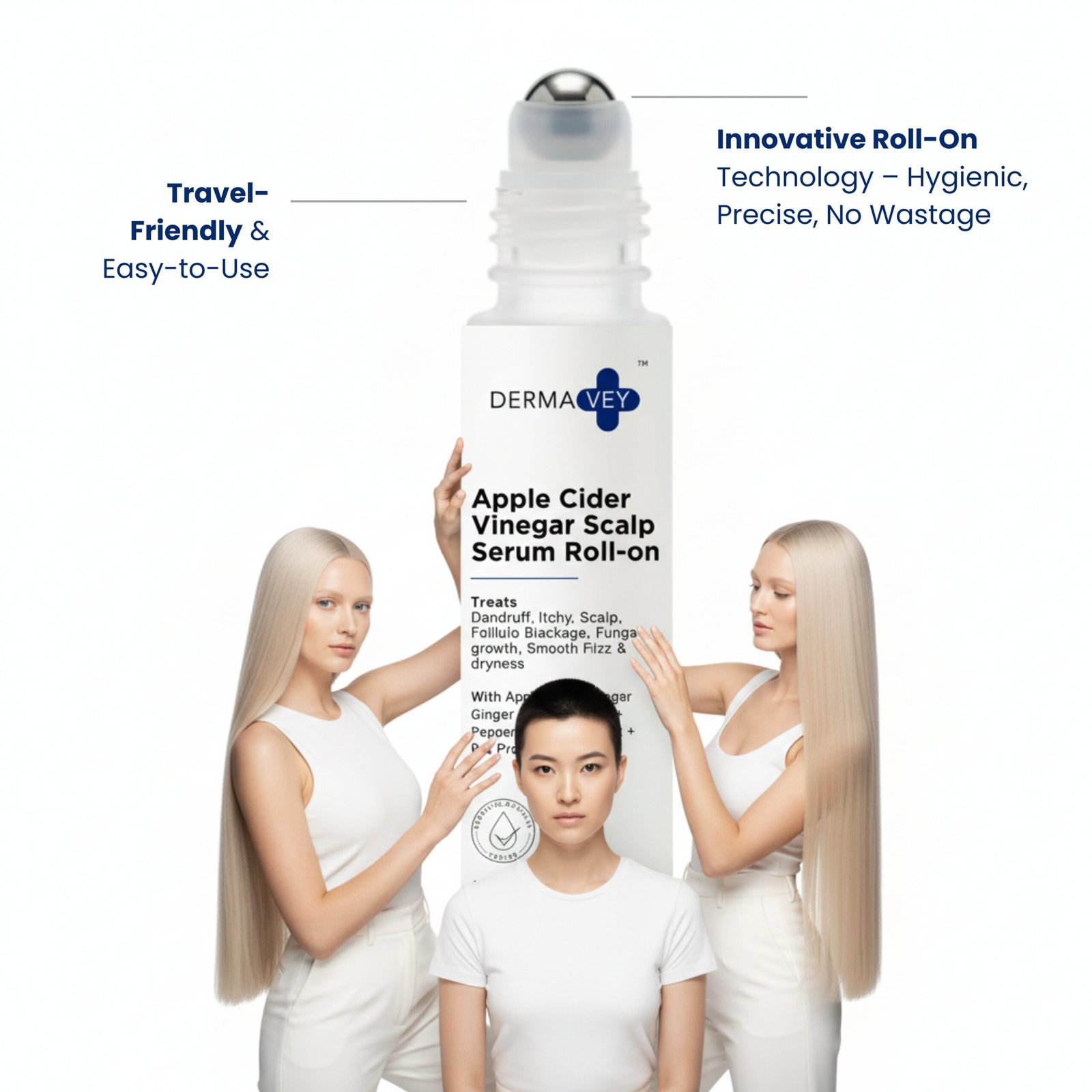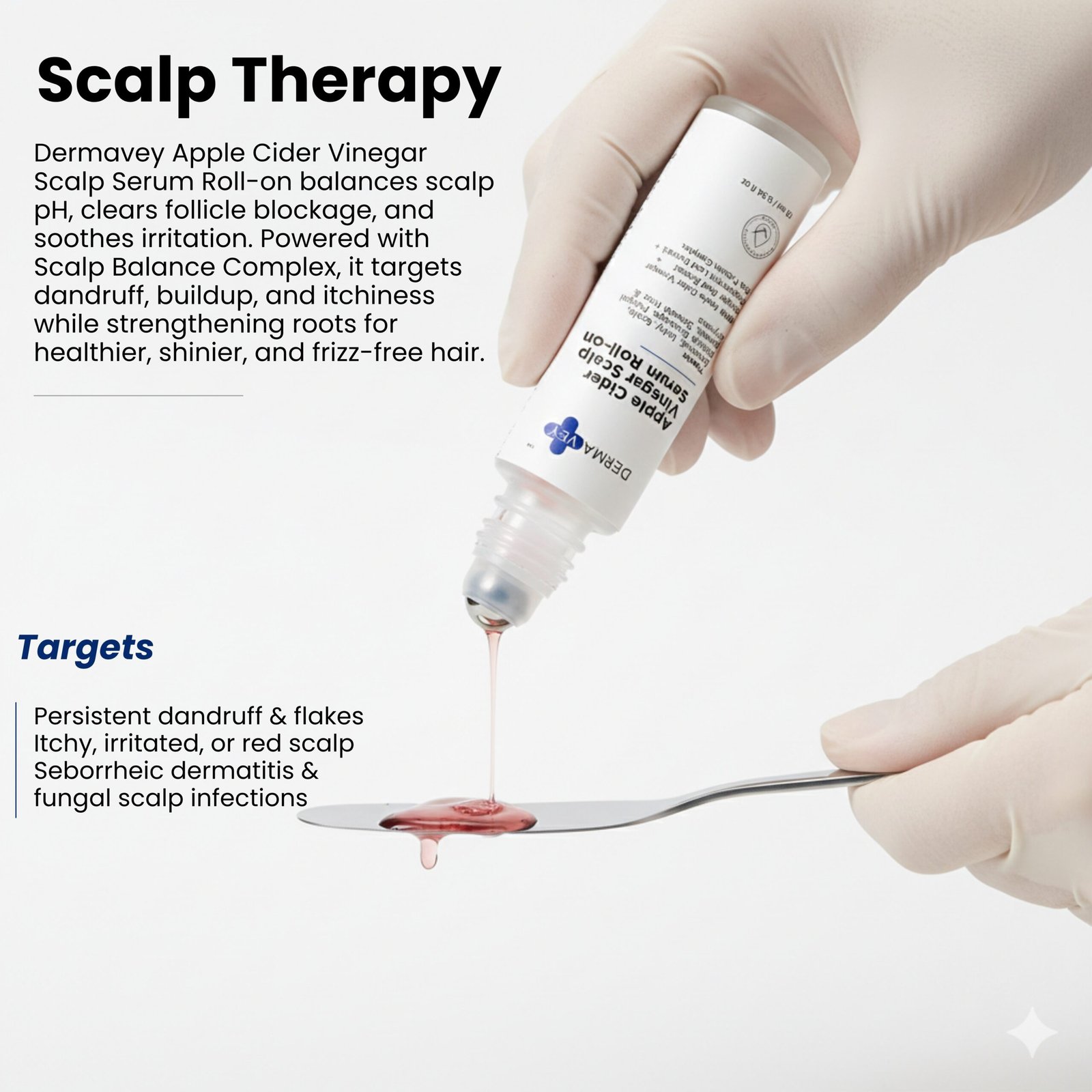Targeted relief for a troubled scalp. This 10 ml roll-on serum treats Dandruff, Itchy Scalp, Follicle blockage, Fungal growth, Smooth frizz, & dryness. It is formulated with Apple Cider Vinegar, Ginger Root Extract %, Peppermint Leaf Extract, and Pea Protein Complex to deliver active ingredients directly where needed for scalp health and relief.