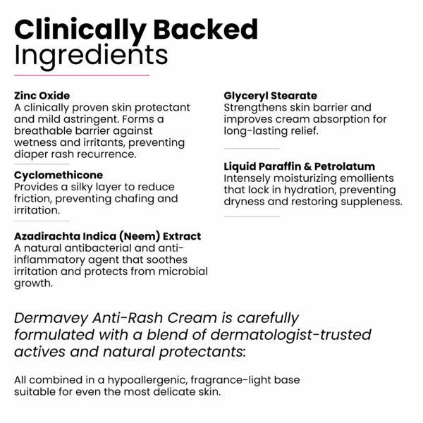 Gentle defense for sensitive skin. This cream is specifically formulated to address Diaper rash, chafing & redness, itching & irritation, sweat rash, heat rash, and dryness around the bum and thighs. It is made with Zinc Oxide, Neem Extract, Liquid Paraffin, Petrolatum, and Cyclomethicone to soothe and protect delicate baby skin. The cream comes in a 50g / 1.76 fl oz size.