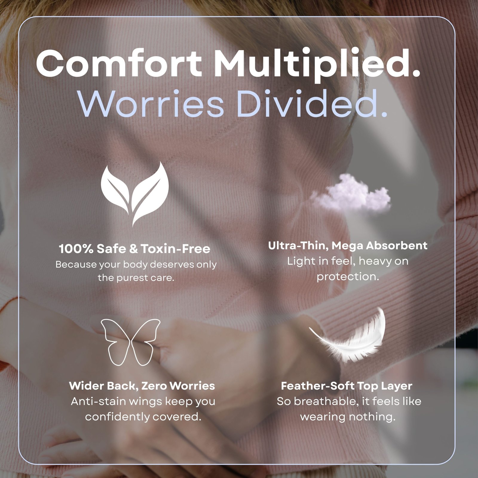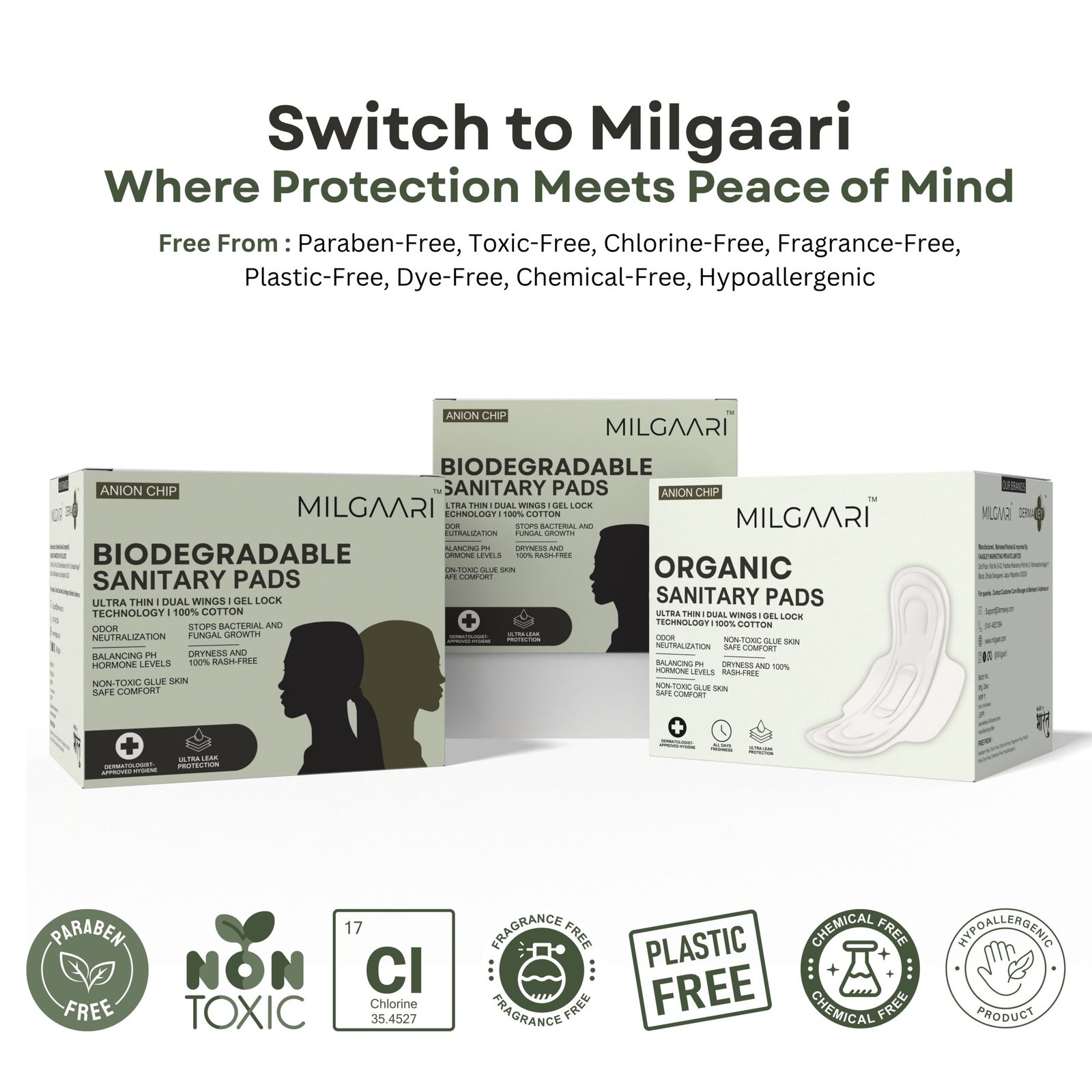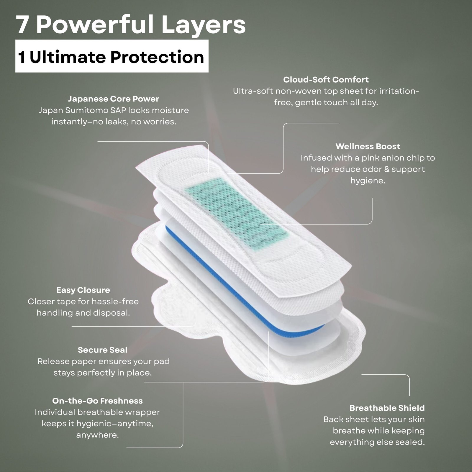 Rethink your routine! These Biodegradable Sanitary Pads are ultra-thin and feature Dual Wings and Gel Lock Technology for superior absorption. They provide Ultra Leak Protection and 100% Rash-Free Comfort with 100% Cotton. The built-in Anion Chip ensures odor neutralization and stops bacterial and fungal growth, promoting balanced pH and hormone levels with non-toxic, skin-safe comfort.