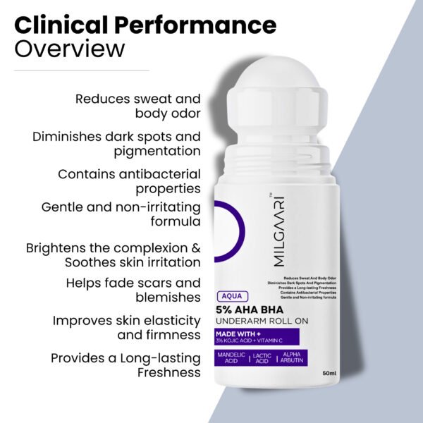 Introducing Milgaari 5% AHA BHA Underarm Roll-On – a gentle yet powerful solution for controlling sweat and body odor. This non-irritating formula is infused with natural ingredients such as Mandelic Acid, Lactic Acid, Alpha Arbutin, and Vitamin C, which work in harmony to lighten dark spots and pigmentation while ensuring lasting freshness. Perfect for all skin types, this roll-on deodorant glides on effortlessly, keeping you feeling confident and rejuvenated throughout the day. Its compact, travel-friendly design allows you to take it with you wherever you go. Discover the joy of staying fresh and odor-free with Milgaari 5% AHA BHA Underarm Roll-On.