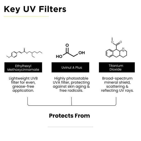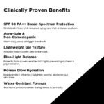Provides broad spectrum UVA/UVB Protection and Blue Light Protection in a Korean formulation. It is enriched with Vitamin C + Niacinamide, along with Green Tea Sprout Extract, Centella Asiatica Extract, Kakadu Plum, and Beta Vulgaris Root Extract. It is safe, gentle & water resistant and aims for a moisturized skin look with no itching or darkness.