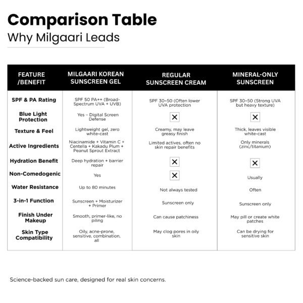 • Why Milgaari sunscreen are so unique : 3x Instant cool Prevents from UV Rays and blue light Protection Deep Hydration Moisturize Skin with Golden Glow. Fade Dark spots. No itching and Darkness. Lightweight & Gel based Easy absorbs formula. Non sticky & No white cast. Safe ,Hydration, Gentle & Water resistant.