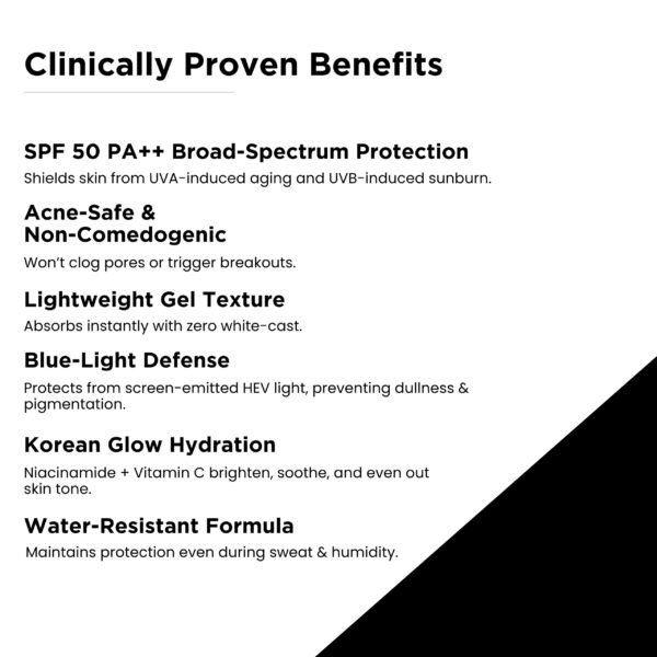 • Lightweight & Gel based Easy absorbs formula , Non sticky & No white cast , Safe ,Hydration,Gentle & Water resistant , Fragrance free , Dermatologist tested , Spreads easily like a lightweight moisturizer and does not leave behind unwanted residue or heavy feeling