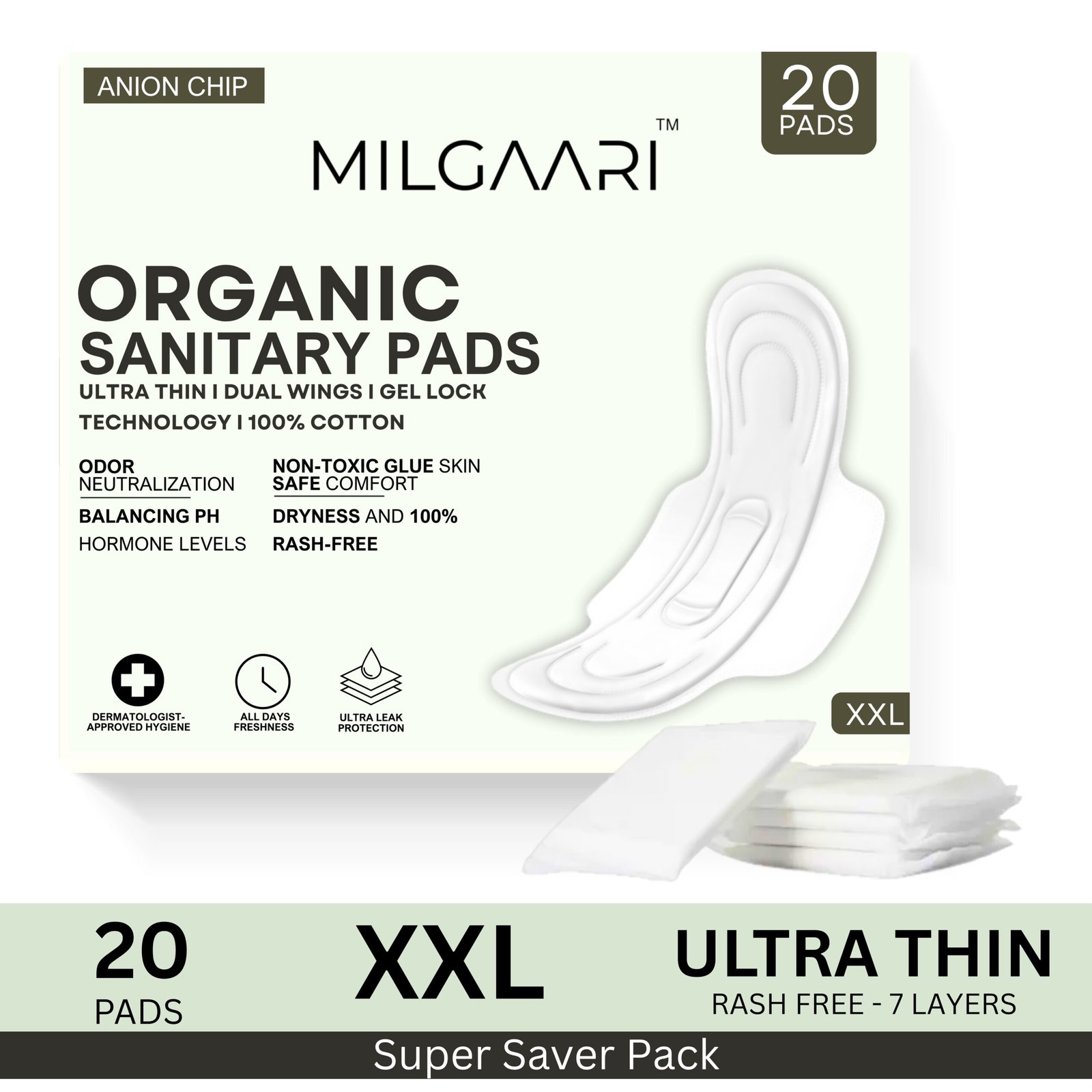 Rethink your routine! These Biodegradable Sanitary Pads are ultra-thin and feature Dual Wings and Gel Lock Technology for superior absorption. They provide Ultra Leak Protection and 100% Rash-Free Comfort with 100% Cotton. The built-in Anion Chip ensures odor neutralization and stops bacterial and fungal growth, promoting balanced pH and hormone levels with non-toxic, skin-safe comfort.