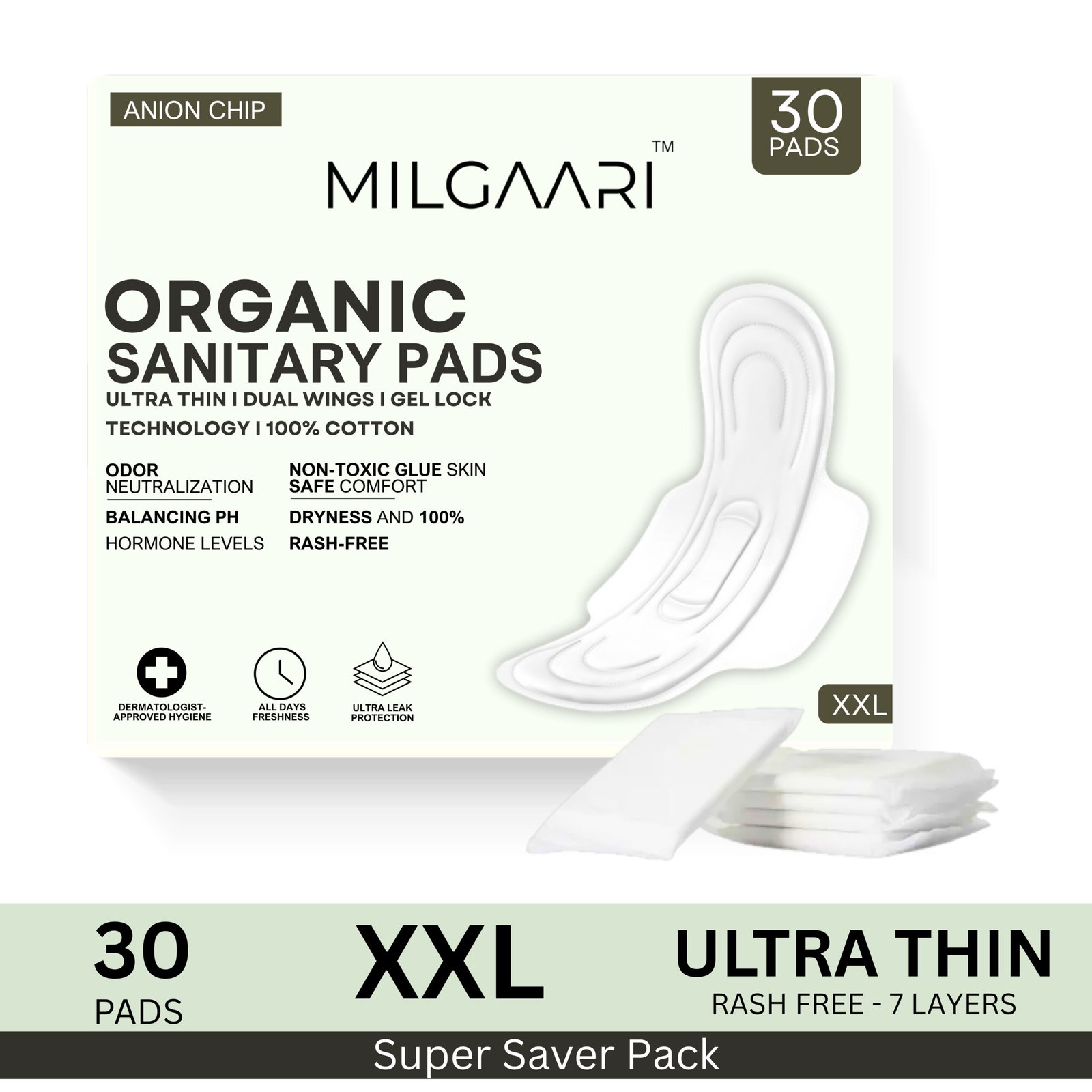 Rethink your routine! These Biodegradable Sanitary Pads are ultra-thin and feature Dual Wings and Gel Lock Technology for superior absorption. They provide Ultra Leak Protection and 100% Rash-Free Comfort with 100% Cotton. The built-in Anion Chip ensures odor neutralization and stops bacterial and fungal growth, promoting balanced pH and hormone levels with non-toxic, skin-safe comfort.